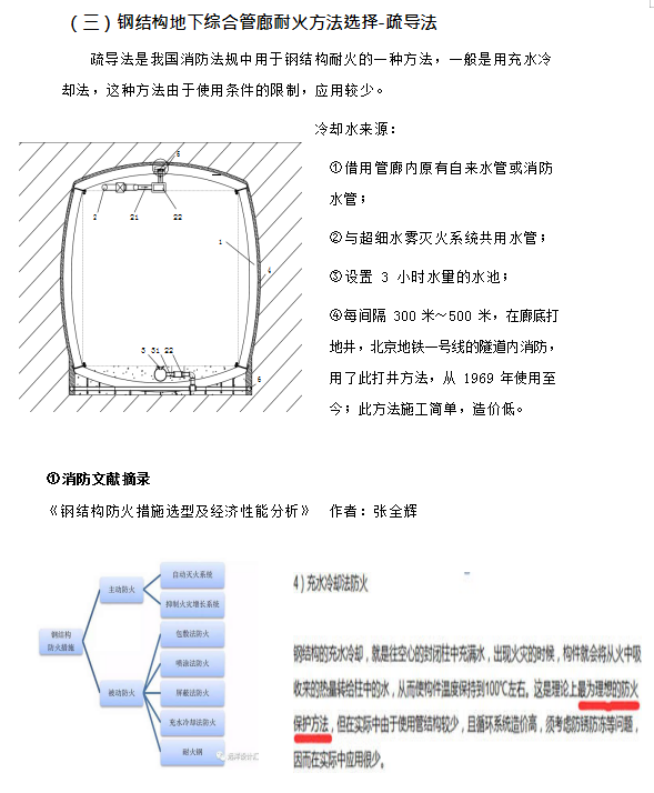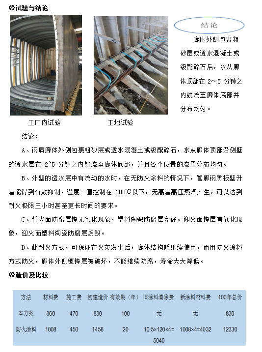 ⑨ 應(yīng)對(duì)耐火極限三小時(shí)的方式是涂耐火涂料,但耐火涂料壽命只有 10~20 年, 并且不能長期耐潮,在壽命到期失效后重新涂刷時(shí),由于內(nèi)部管線及設(shè)施的存在, 清除殘余失效涂層的工作量大,涂刷新涂層更繁雜,費(fèi)用較初次施工時(shí)大大增加, 并且在管廊整個(gè)壽命周期內(nèi)要多次更換防火涂層;更為重要的是,耐火涂料只能阻止火災(zāi)時(shí)鋼結(jié)構(gòu)的溫度不高于 550℃,但對(duì)于鋼結(jié)構(gòu)地下管廊來說情況特殊,在火災(zāi)發(fā)生半小時(shí)左右,耐火涂料覆蓋的鋼結(jié)構(gòu)體溫度就超過 150℃,廊體外部土壤中的水份形成高溫高壓蒸汽,其產(chǎn)生的次生災(zāi)害有可能嚴(yán)重于火災(zāi)本身。